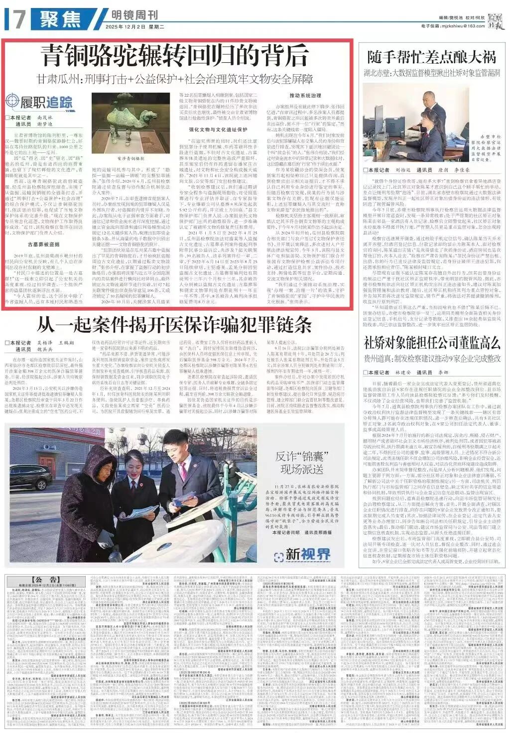 2025年12月2日,检察日报第7版明镜周刊·聚焦刊发《青铜骆驼辗转回归的背后》。