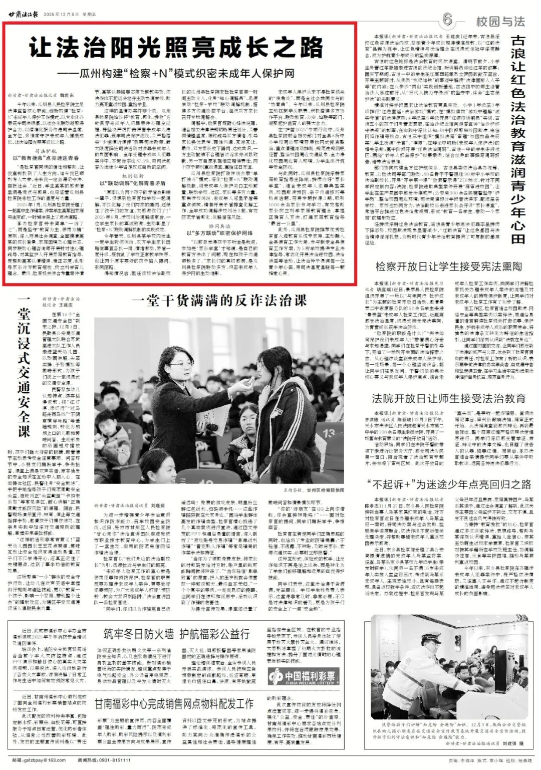 2025年12月5日,甘肃法治报第6版刊发《让法治阳光照亮成长之路——瓜州构建“检察+N”模式织密未成年人保护网》